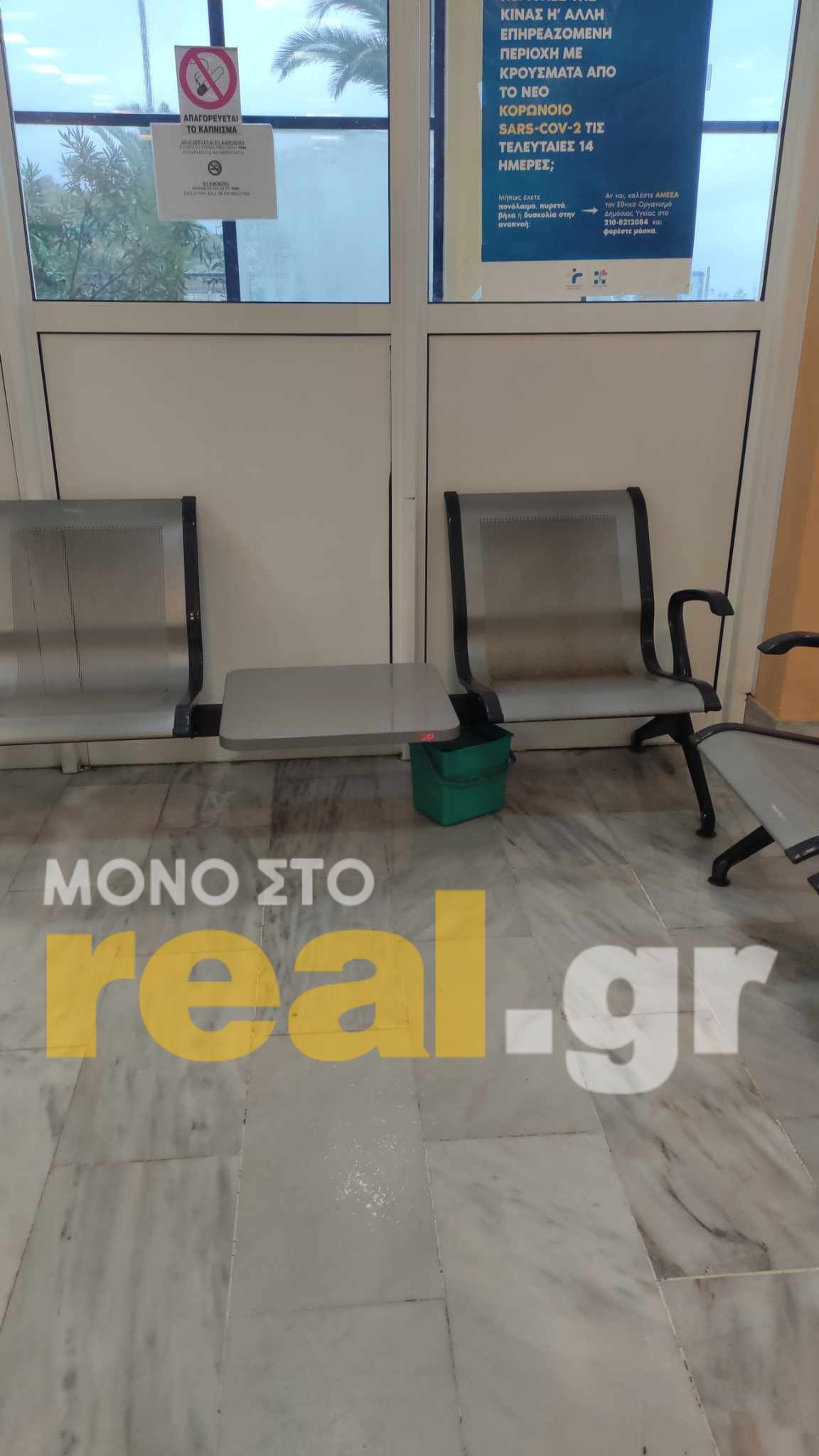 Στις φωτογραφίες φαίνεται να έχει πλημμυρίσει το πάτωμα μπροστά από τα γκισέ του check in που παρέμεναν άδεια. Ενώ, κάτω από τις καρέκλες οι υπάλληλοι είχαν τοποθετήσει δοχεία σε μια προσπάθεια να μαζέψουν τα νερά.