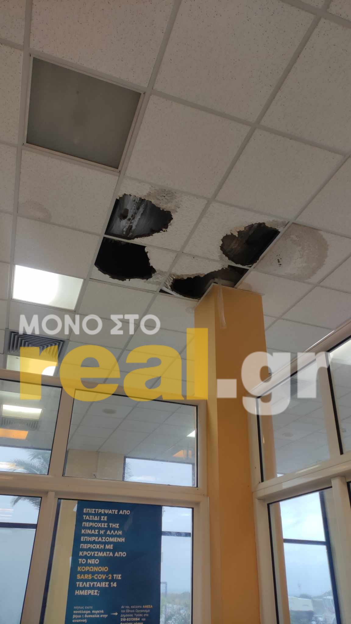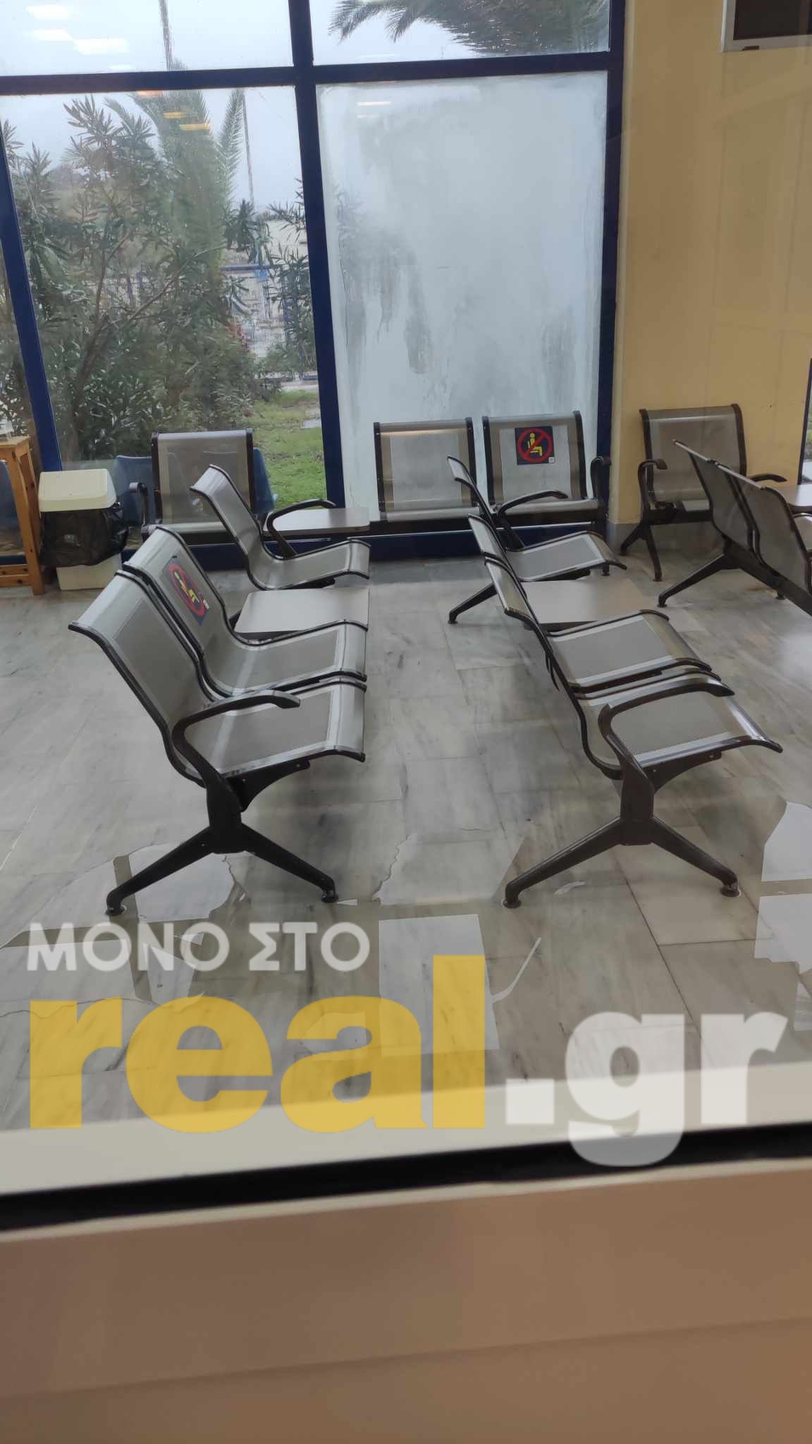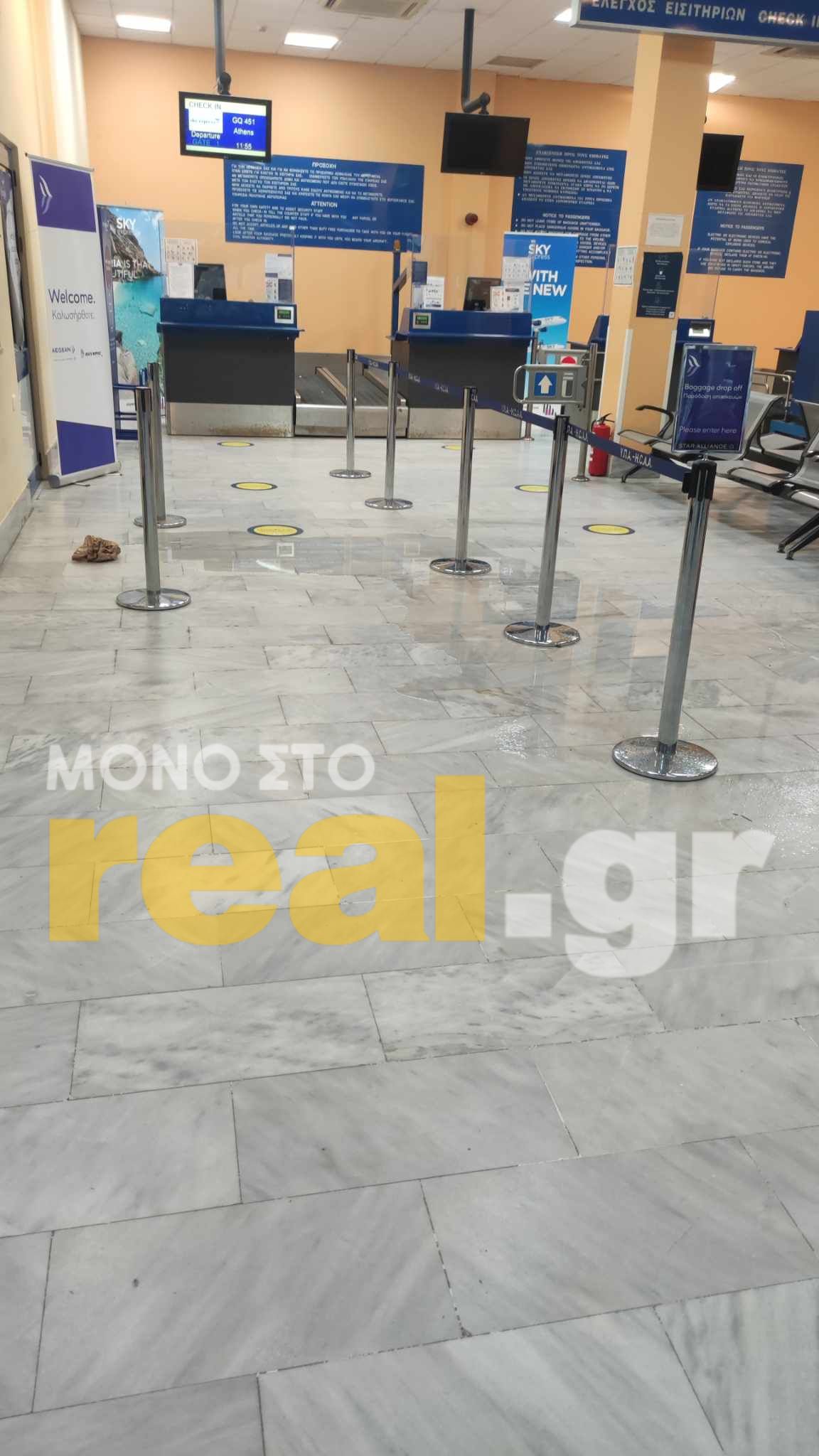 Η καταιγίδα που έπληξε το νησί άφησε τα σημάδια της στις αίθουσες αναχωρήσεων και αναμονής όπως φαίνεται και στις φωτογραφίες που δημοσιεύει το real.gr.