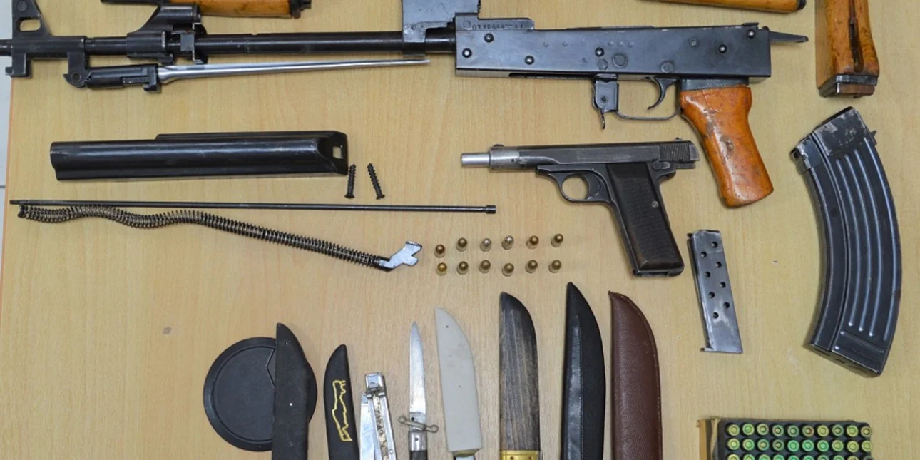 Κατά τον έλεγχο βρέθηκαν και κατασχέθηκαν ένα πολεμικό τυφέκιο τύπου καλάσνικοφ με αναδιπλούμενη ξιφολόγχη και γεμιστήρα.