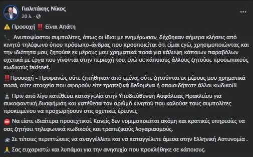 Ο κ. Γιαλιτάκης στην ανάρτησή του, καλεί τους πολίτες να είναι προσεκτικοί και τους παροτρύνει να καταγγέλλουν τέτοιου είδους περιστατικά στην αστυνομία.
