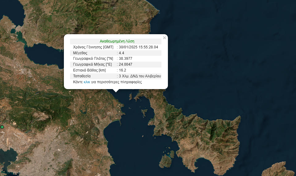 Το επίκεντρο της δόνησης εντοπίστηκε 3 χιλιόμετρα βορειοδυτικά του Αλιβερίου, ενώ το εστιακό βάθος υπολογίστηκε στα 16,2 χιλιόμετρα.