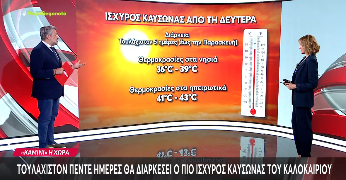 Σύμφωνα με τον Γιάννη Καλλιάνο, από τη Δευτέρα ξεκινάει ισχυρός καύσωνας, ο οποίος θα έχει διάρκεια τουλάχιστον πέντε ημέρες, έως την Παρασκευή, με θερμοκρασίες στα νησιά 36-39 βαθμούς Κελσίου και στα ηπειρωτικά 41-43 βαθμούς.