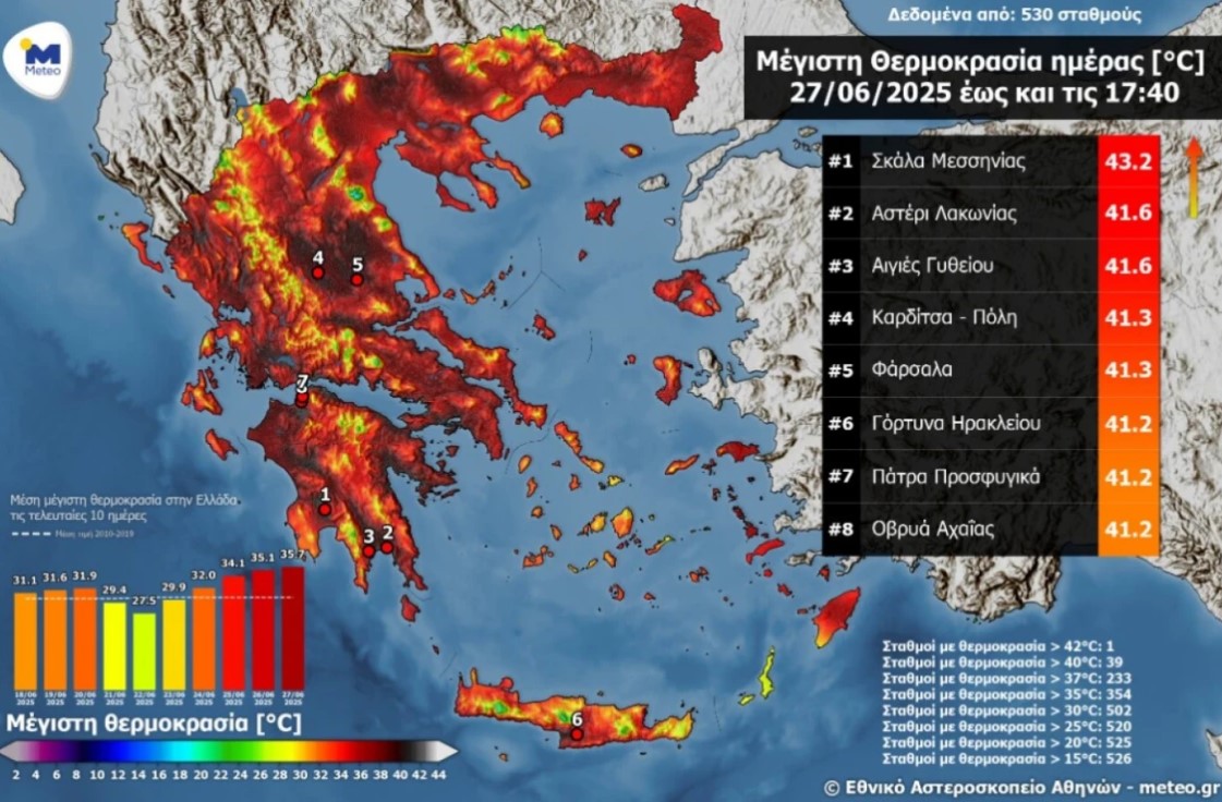 Πέρα από τους 43,2 βαθμούς της Σκάλας Μεσσηνίας, οι υψηλότερες τιμές που καταγράφηκαν είναι οι εξής: