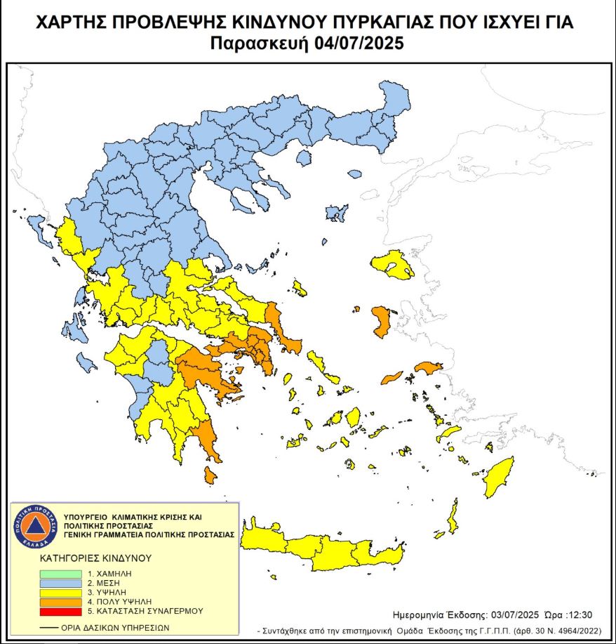 Πολύ υψηλός κίνδυνος πυρκαγιάς (κατηγορία κινδύνου 4) προβλέπεται για την Παρασκευή, σε Αττική, Κύθηρα, Εύβοια, περιοχές της Πελοποννήσου και του Βορείου Αιγαίου, σύμφωνα με το Χάρτη Πρόβλεψης Κινδύνου Πυρκαγιάς, που εκδίδει η γενική γραμματεία Πολιτικής Προστασίας του υπουργείου Κλιματικής Κρίσης και Πολιτικής Προστασίας (civilprotection.gov.gr).