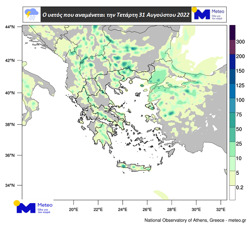 Στον χάρτη παρουσιάζεται ενδεικτικά ο υετός που αναμένεται τις απογευματινές ώρες της Τετάρτης 31/08 στην Αττική αλλά και την Ανατολική Στερεά και Πελοπόννησο.