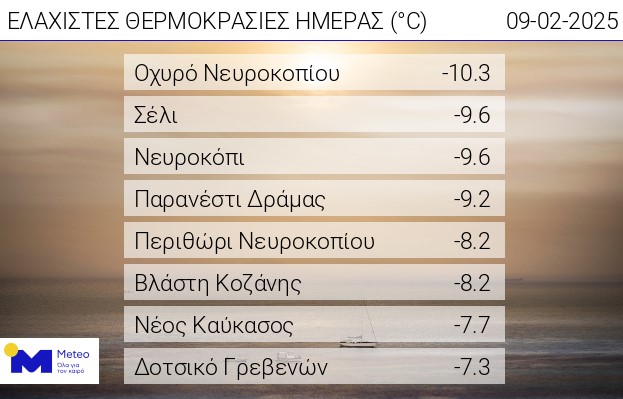 Η χαμηλότερη θερμοκρασία σημειώθηκε στο Οχυρό Νευροκοπίου με -10,3 βαθμούς Κελσίου. Σύμφωνα με το δίκτυο αυτόματων μετεωρολογικών σταθμών του Εθνικού Αστεροσκοπείου Αθηνών / meteo.gr οι οκτώ χαμηλότερες ελάχιστες θερμοκρασίες της ημέρας είναι οι εξής: