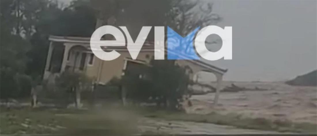 Επιπρόσθετα, ο δρόμος που οδηγεί από το Μαντούδι στο λιμάνι έχει διαλυθεί, ενώ στην Κρύα Βρύση σπίτι οδηγήθηκε στη θάλασσα από τα ορμητικά νερά.
