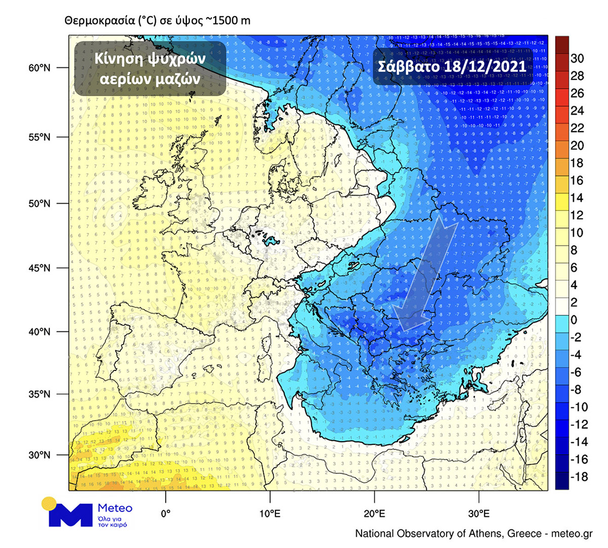 Ο χάρτης δείχνει με αποχρώσεις του μπλε την πολική αέρια μάζα που θα καλύψει το μεγαλύτερο μέρος της Ανατολικής Ευρώπης και τα Βαλκάνια το Σάββατο.