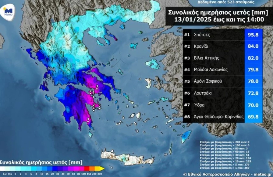Στον παρακάτω χάρτη αποτυπώνονται τα συνολικά ύψη βροχόπτωσης έως τις 14:00 της Δευτέρας 13/01 όπως αυτά καταγράφηκαν από 523 μετεωρολογικούς σταθμούς του δικτύου αυτόματων μετεωρολογικών σταθμών του Εθνικού Αστεροσκοπείου Αθηνών / meteo.gr, ενώ επισημαίνονται τα 8 μεγαλύτερα.
