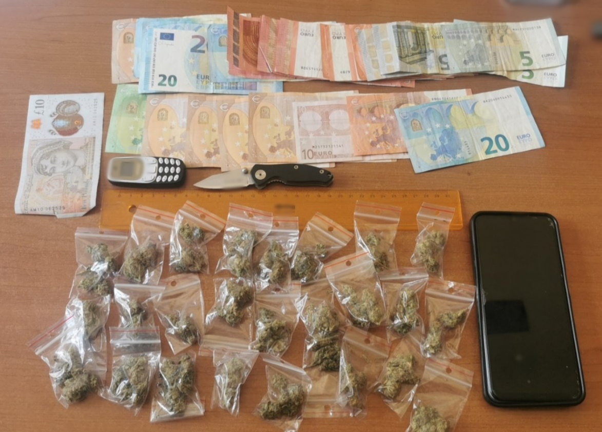 Ο βασικός κατηγορούμενος συνελήφθη ενώ οδηγούσε Ι.Χ.Ε. αυτοκίνητο, και σε έρευνα που διενεργήθηκε στην κατοχή του, καθώς και στην οικία του, βρέθηκαν και κατασχέθηκαν 28 αυτοσχέδιες συσκευασίες με ακατέργαστη κάνναβη, συνολικού μεικτού βάρους 30,5 γραμμαρίων, το χρηματικό ποσό των 650 ευρώ, ένα χαρτονόμισμα των 10 λιρών Αγγλίας, δύο κινητά τηλέφωνα και ένας αναδιπλούμενος σουγιάς. Λίγες ώρες αργότερα, συνελήφθησαν ακόμη δύο ημεδαποί, στην κατοχή των οποίων βρέθηκαν επίσης μικροποσότητες ακατέργαστης κάνναβης, 1,10 γραμμάρια ο ένας και 0,90 γραμμάρια ο δεύτερος.