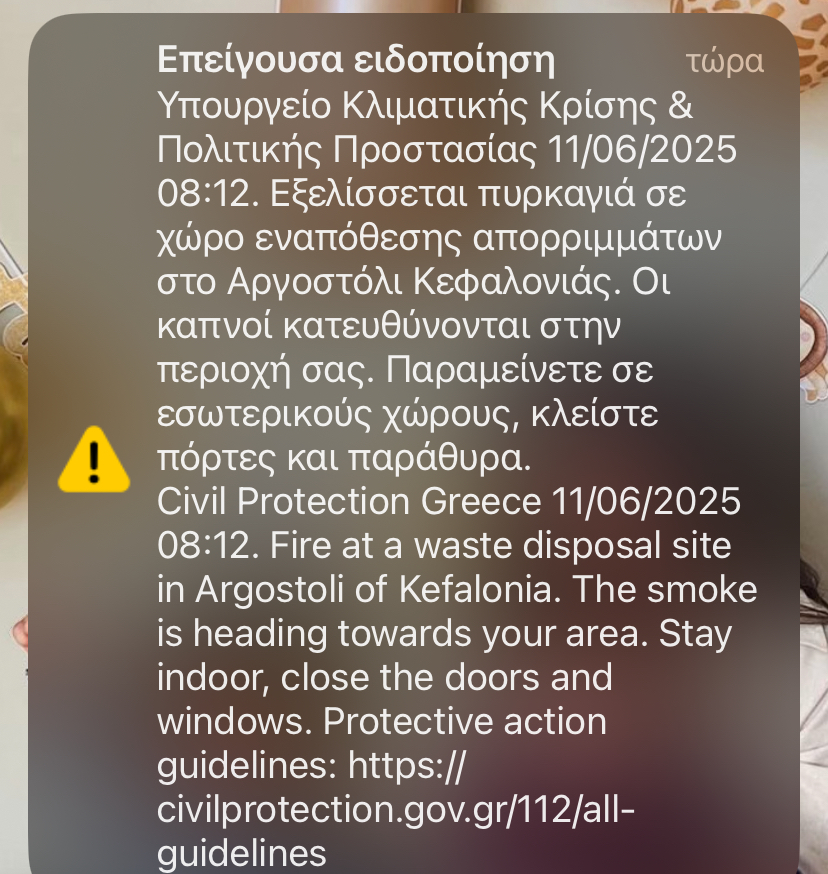 Στις 08:12 οι κάτοικοι και οι τουρίστες της Κεφαλονιάς έλαβαν προειδοποιητικό μήνυμα από το 112, στο οποίο αναφέρεται ότι «εξελίσσεται πυρκαγιά σε χώρο εναπόθεσης απορριμμάτων στο Αργοστόλι Κεφαλονιάς. Οι καπνοί κατευθύνονται στην περιοχή σας. Παραμείνετε σε εσωτερικούς χώρους, κλείστε πόρτες και παράθυρα».