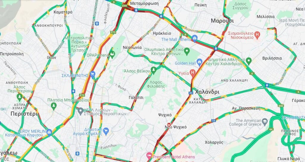 Παράλληλα, κυκλοφοριακή συμφόρηση παρουσιάζεται στις Λεωφόρους Κηφισίας, Βασιλίσσης Σοφίας και Συγγρού.