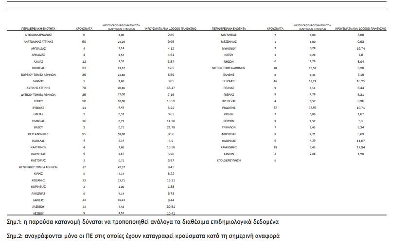 Η κατανομή των 787 νέων εγχώριων κρουσμάτων ανά Περιφερειακή Ενότητα παρουσιάζεται στον κατωτέρω πίνακα: