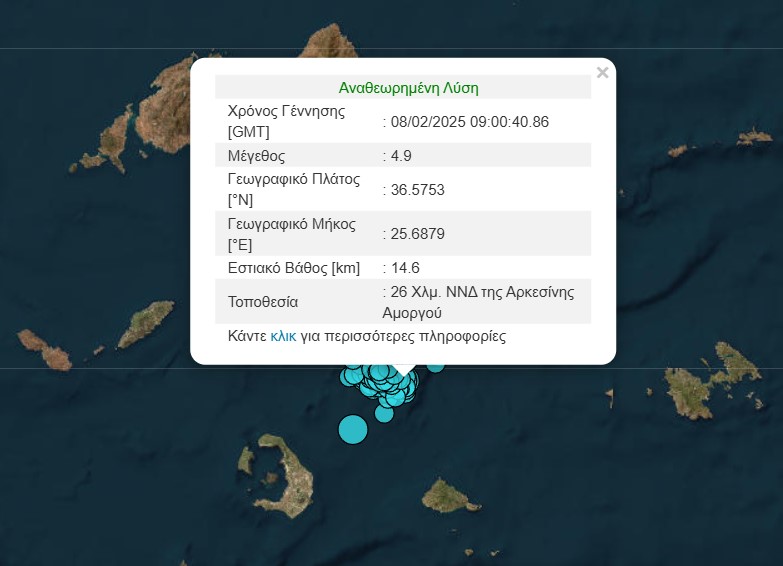 Νέα σεισμική δόνηση μεγέθους 4,9 βαθμών της κλίμακας Ρίχτερ σημειώθηκε στις 11:00 το πρωί. Σύμφωνα με το Γεωδυναμικό Ινστιτούτο του Εθνικού Αστεροσκοπείου Αθηνών, το επίκεντρο της δόνησης εντοπίζεται στον θαλάσσιο χώρο 26 χιλιόμετρα νότια νοτιοδυτικά της Αρκεσίνης Αμοργού με το εστιακό της βάθος να υπολογίζεται στα 14,6 χιλιόμετρα.