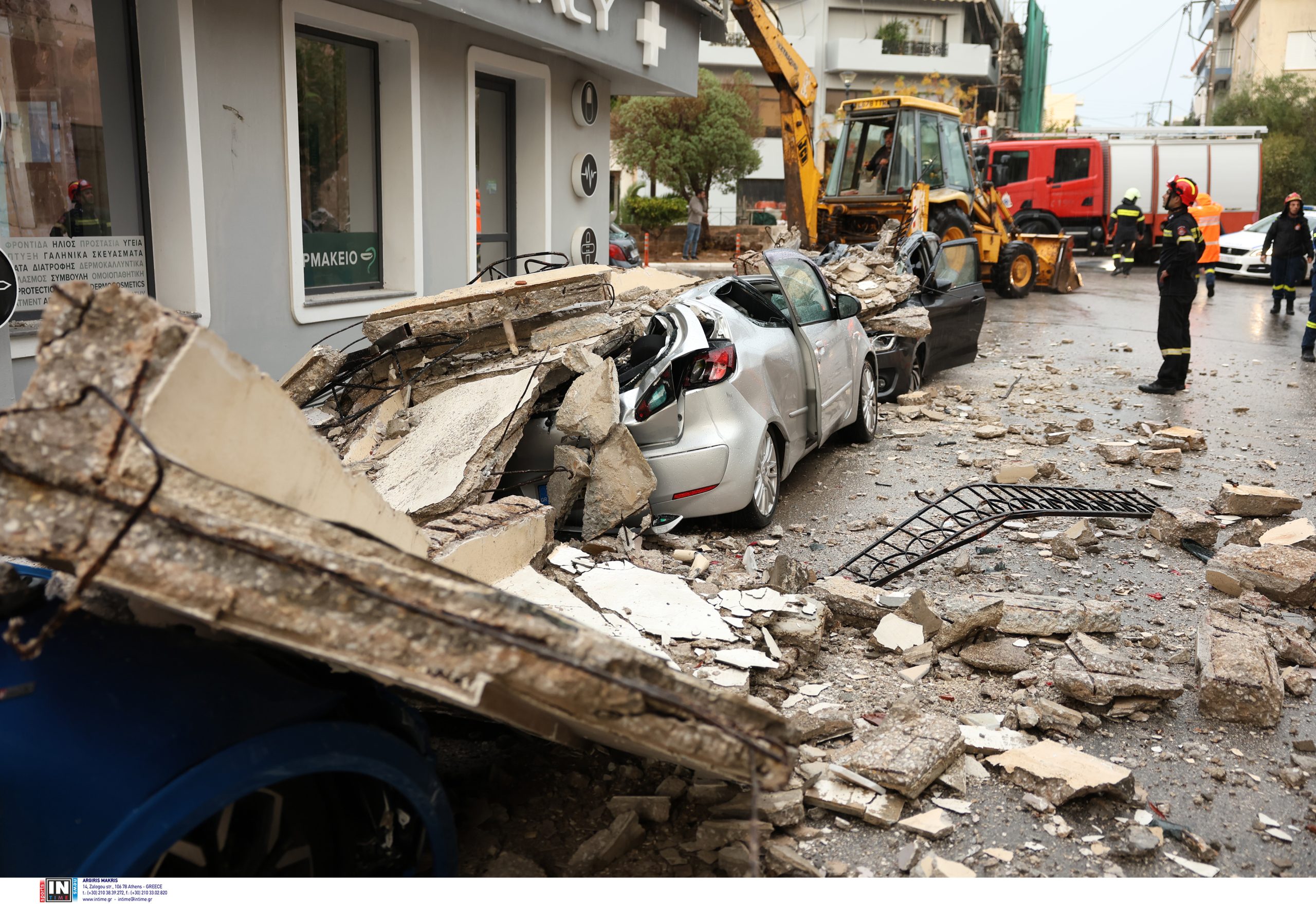 Από τα συντρίμμια προκλήθηκαν ζημιές σε σταθμευμένα αυτοκίνητα ενώ τραυματίστηκε ελαφρά μία γυναίκα.