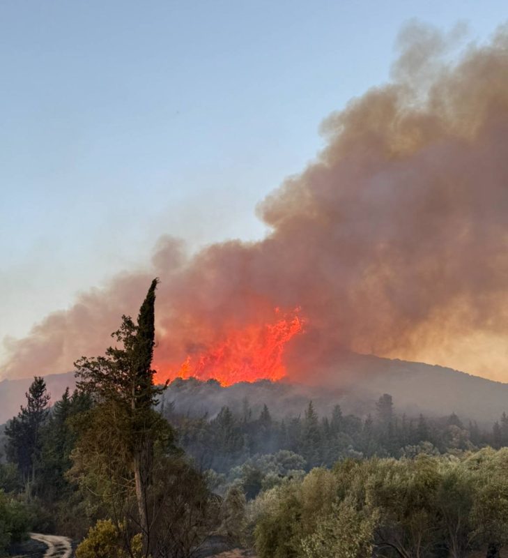 Από την άλλη πλευρά του βουνού οι φλόγες συνεχίζουν να καίνε το πευκοδάσος και κατευθύνονται προς το χωριό Κερί.