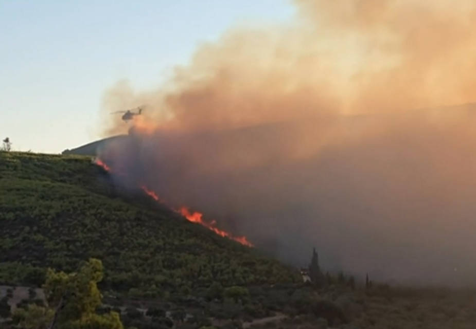 Από την άλλη πλευρά του βουνού οι φλόγες συνεχίζουν να καίνε το πευκοδάσος και κατευθύνονται προς το χωριό Κερί.