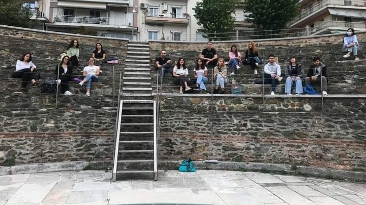 Η διδάσκουσα του Τμήματος και συγγραφέας Σοφία Νικολαΐδου σκεφτόταν, από το καλοκαίρι ακόμη, πως να υποδεχτεί τους φοιτητές σε αυτή τη δύσκολη κατάσταση. “ Ήθελα να δω τα πρόσωπά τους και με τη μάσκα αυτό δε γίνεται”, εξηγεί. Φρόντισε από νωρίς και πήρε την απαιτούμενη άδεια από την Εφορεία Αρχαιοτήτων Πόλης Θεσσαλονίκης για να πραγματοποιηθεί το μάθημα στην Αρχαία Αγορά, ενημέρωσε διαδικτυακά τους φοιτητές/τριες για τη μορφή που θα έχει αυτό και τελικά το μάθημα έδωσε στα παιδιά πολλά παραπάνω απ’ ό,τι ένα κλασσικό μάθημα στις αίθουσες του Τμήματος ή διαδικτυακά.