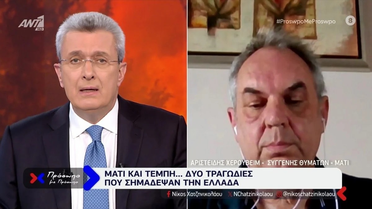 Σε παρέμβασή του στη συνέχεια της εκπομπής ο Αριστείδης Χερουβείμ, συγγενής θυμάτων από τη φονική πυρκαγιά στο Μάτι, τόνισε: «Πριν από έξι χρόνια έφτασε η δική μου μήνυση στη Βουλή. Θα ήθελα να ρωτήσω γιατί η δική μου μήνυση δεν βγήκε ποτέ από το συρτάρι του κ. Βούτση και του κ. Τασούλα; Επίσης, σε μένα συμβαίνει το εξής. Ο ποινικός κώδικας δεν μου επιτρέπει να εκπροσωπήσω τις δύο ανιψιές μου γιατί έχω τρίτου βαθμού συγγένεια. Κοινώς, τα δύο κοριτσάκια για την ελληνική πολιτεία δεν υπάρχουν».