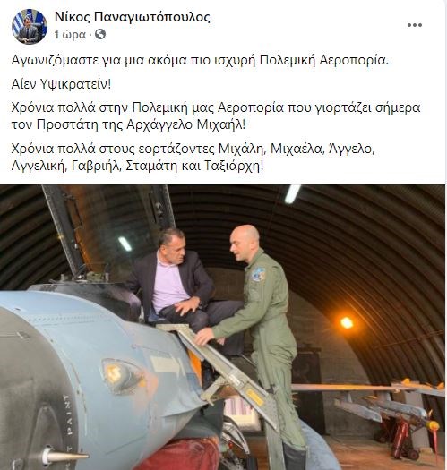 «Αγωνιζόμαστε για μια ακόμα πιο ισχυρή Πολεμική Αεροπορία. Αίεν Υψικρατείν! Χρόνια πολλά στην Πολεμική μας Αεροπορία που γιορτάζει σήμερα τον Προστάτη της Αρχάγγελο Μιχαήλ! Χρόνια πολλά στους εορτάζοντες Μιχάλη, Μιχαέλα, Άγγελο, Αγγελική, Γαβριήλ, Σταμάτη και Ταξιάρχη!» έγραψε ο υπουργός.