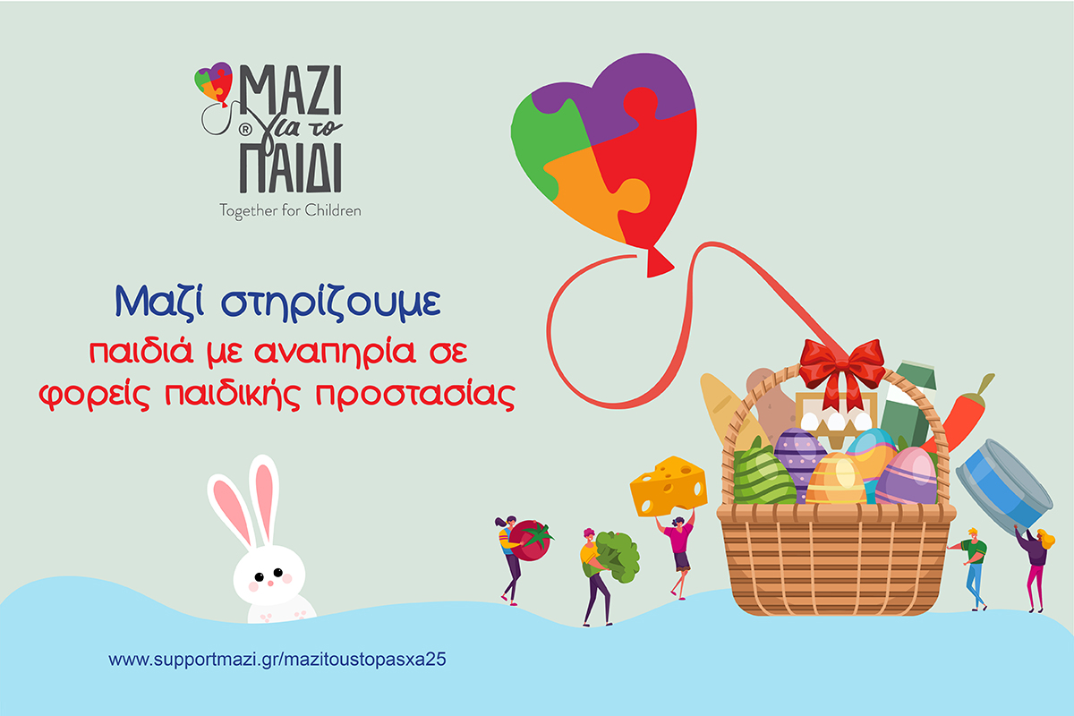 Το Μαζί για το Παιδί σας προσκαλεί φέτος το Πάσχα να γίνετε μέρος μιας πρωτοβουλίας αγάπης και προσφοράς, στηρίζοντας 250 παιδιά με αναπηρία που φιλοξενούνται σε φορείς παιδικής προστασίας σε όλη την Ελλάδα.