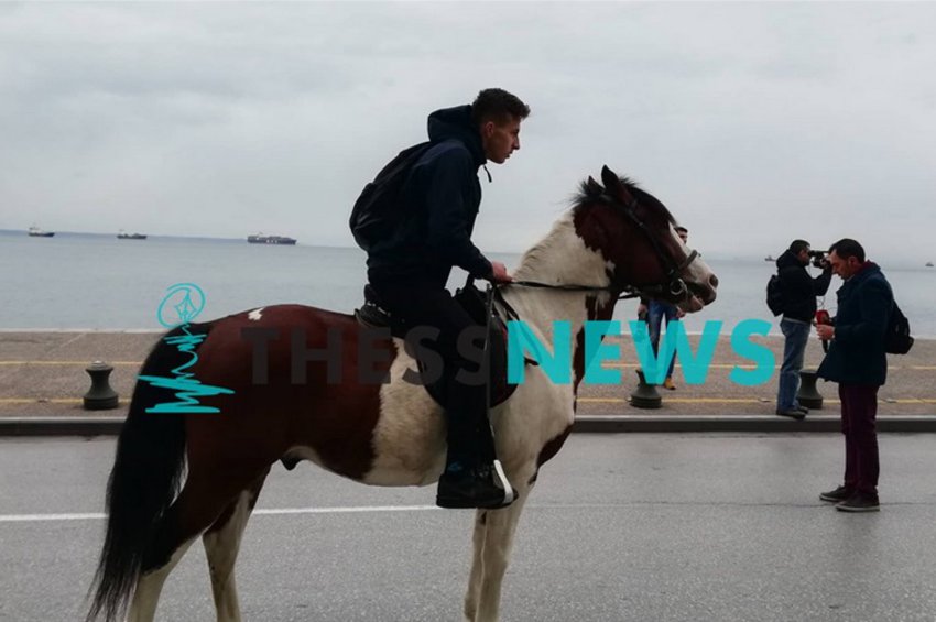 Ο νεαρός αναβάτης -όπως αναφέρει το thessnews- είναι μαθητής από το 1ο ΕΠΑΛ Ευόσμου και πήγε μέχρι τον Λευκό Πύργο με το άλογο του, μια κίνηση συμβολικής σημασίας που παραπέμπει στο Βουκεφάλα του Μεγάλου Αλεξάνδρου.