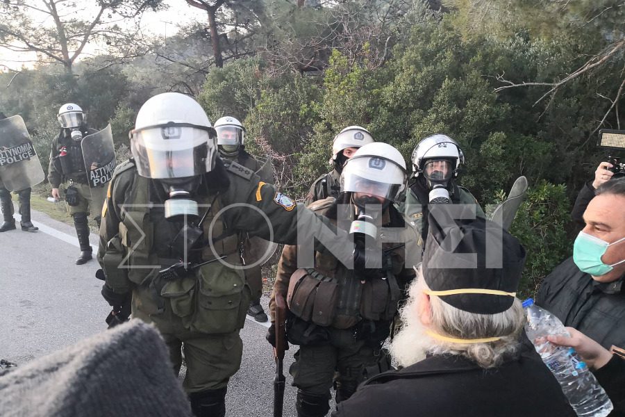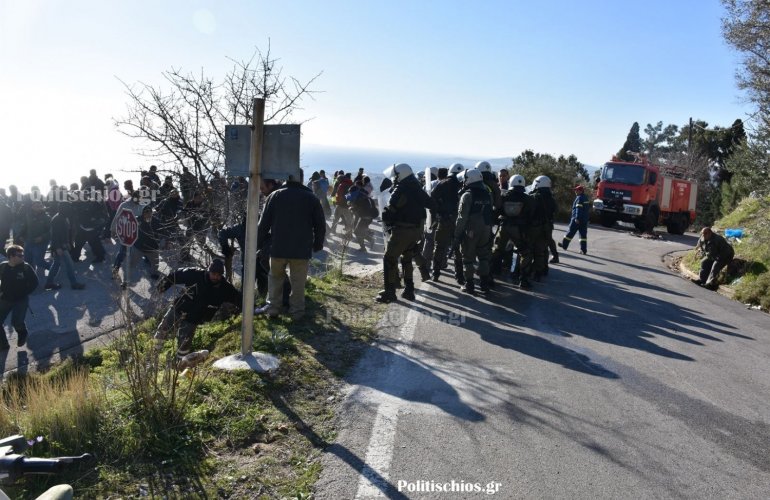 Οι αστυνομικές δυνάμεις έκαναν χρήση χειροβομβίδων κρότου λάμψης και χημικών ενάντια στους συγκεντρωμένους που διαμαρτύρονται για την επίταξη και τη νέα κλειστή δομή που σχεδιάστηκε να κατασκευαστεί στη Λέσβο. Ας σημειωθεί ότι κατά την επίθεση με τα χημικά ξέσπασαν μικρές πυρκαγιές σε δασική έκταση, οι οποίες αντιμετωπίσθηκαν άμεσα.
