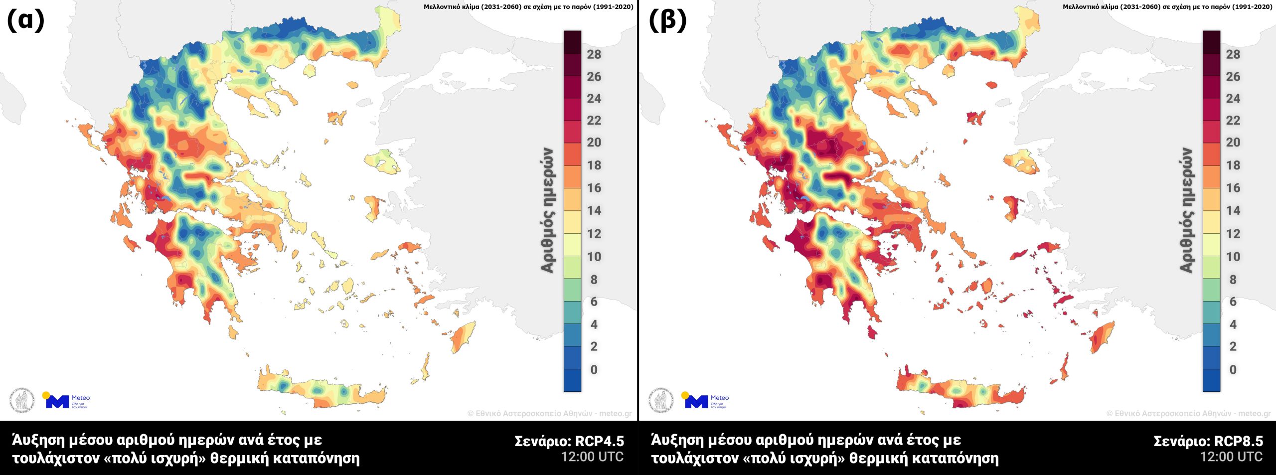 • «πολύ ισχυρή» θερμική καταπόνηση αναμένεται να αυξηθεί μέχρι 22 ημέρες σύμφωνα με το σενάριο RCP4.5 και μέχρι 28 ημέρες σύμφωνα με το σενάριο RCP8.5. Η αύξηση αυτή είναι ιδιαίτερα αισθητή στη δυτική Ελλάδα και Πελοπόννησο (Εικόνα 2) ενώ έντονη αναμένεται να είναι και σε περιοχές της Θεσσαλίας και της Αττικής (Εικόνα 2β).
