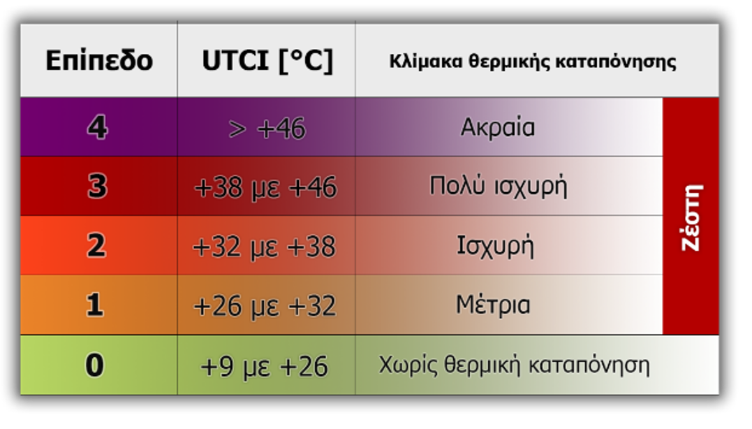 Για παράδειγμα, όταν η θερμοκρασία UTCI κυμαίνεται μεταξύ 26 °C και 32 °C, θεωρείται ότι προκαλείται «μέτρια» θερμική καταπόνηση λόγω ζέστης. Σε υψηλότερες τιμές, από 32 °C έως 38 °C, η καταπόνηση είναι «ισχυρή», ενώ μεταξύ 38 °C και 46 °C γίνεται «πολύ ισχυρή». Πάνω από τους 46 °C, η καταπόνηση είναι «ακραία» και η κατάσταση χαρακτηρίζεται ως εξαιρετικά επικίνδυνη για την υγεία.