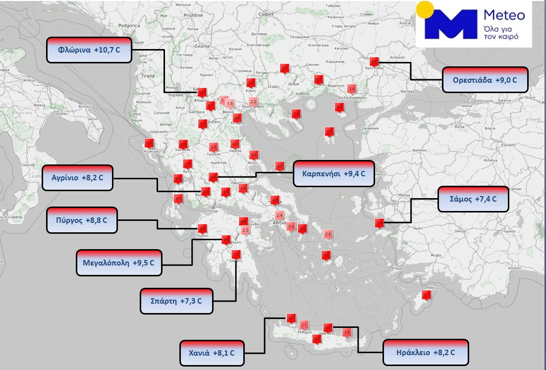 Στο χάρτη που ακολουθεί φαίνεται η γεωγραφική κατανομή της μέγιστης θερμοκρασίας το μεσημέρι της Δευτέρας καθώς και οι τιμές της σε επιλεγμένες πόλεις.