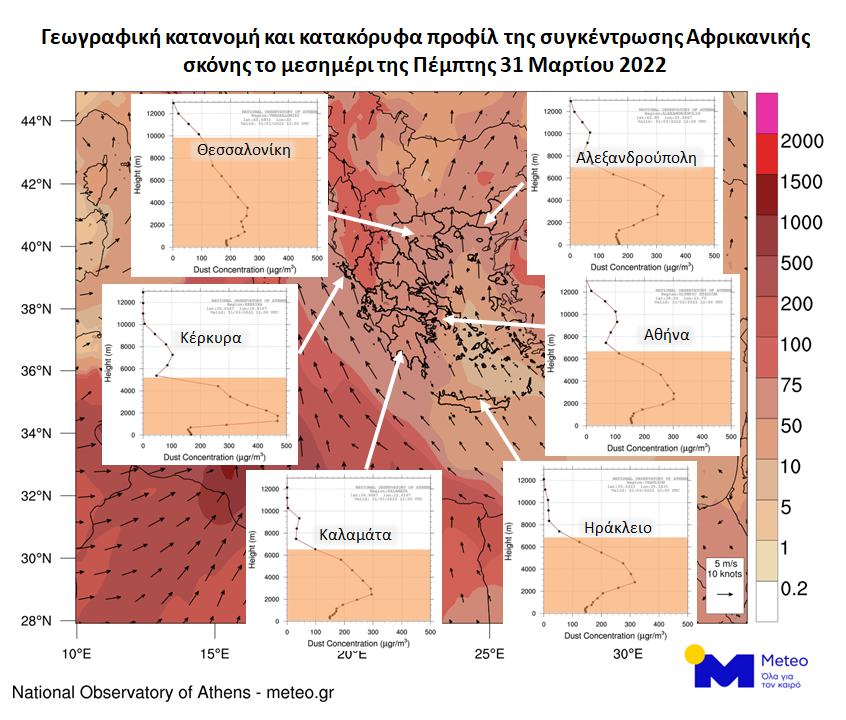 Η συγκέντρωση σκόνης αναμένεται να ξεπερνά σε πολλές περιοχές τα 100 μg/m3 (μικρογραμμάρια ανά κυβικό μέτρο αέρα) και σε μερικές περιπτώσεις όπως στην Αθήνα να φθάνει τα 300, ενώ στην Κέρκυρα να προσεγγίζει τα 500.