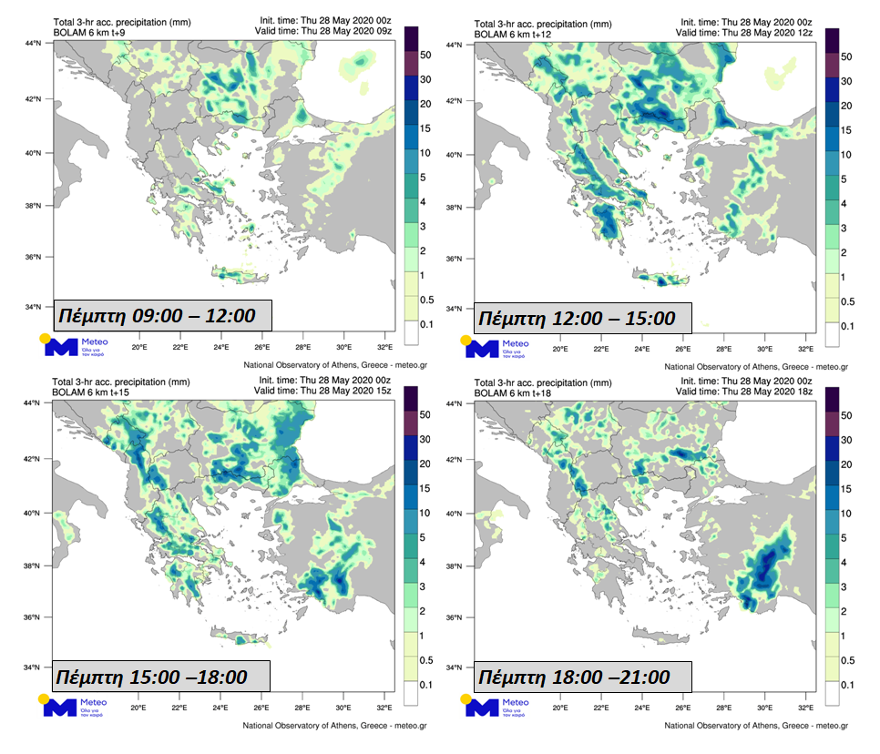 Πιθανότητα χαλαζοπτώσεων υπάρχει κυρίως στις νησιωτικές και παράκτιες περιοχές έως το μεσημέρι και στη Θράκη το μεσημέρι και το απόγευμα. Προς το βράδυ τα φαινόμενα θα περιοριστούν στα βόρεια τμήματα της χώρας και θα εξασθενήσουν.