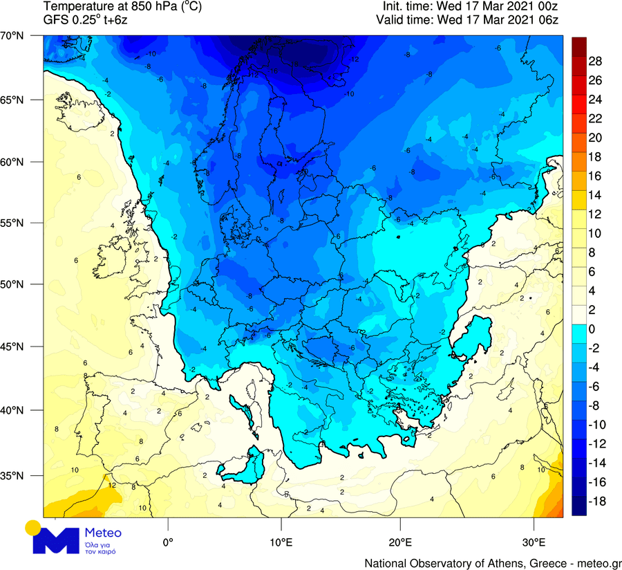 Ταυτόχρονα, ψυχρές αέριες μάζες επικρατούν ήδη στο μεγαλύτερο τμήμα της Ευρώπης, οι οποίες έχουν ως αποτέλεσμα τις σχετικά χαμηλές θερμοκρασίες. Αυτές οι ψυχρές αέριες μάζες φαίνεται να διατηρούνται και τις επόμενες ημέρες