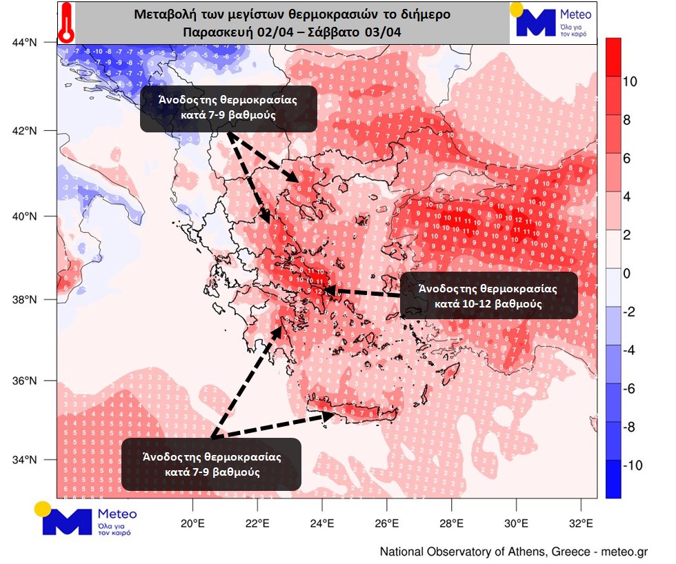 Οι μέγιστες θερμοκρασίες τις μεσημεριανές ώρες του Σαββάτου θα είναι κατά μέσο όρο 7 έως 9 βαθμούς υψηλότερες σε σχέση με τις μέγιστες θερμοκρασίες της Πέμπτης, ενώ στην Αττική, στη Βοιωτία και στην Εύβοια η άνοδος της θερμοκρασίας θα είναι της τάξης των 10 έως 12 βαθμών Κελσίου.