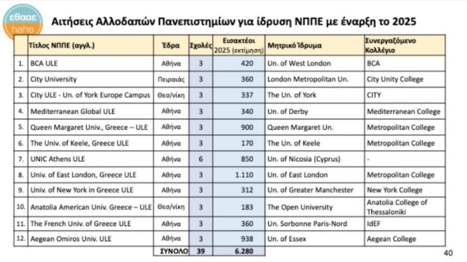 Αρχικά, η πλειονότητα των νέων ιδρυμάτων αναμένεται να εγκατασταθεί στην Αττική, ενώ κάποια θα λειτουργήσουν και στη Θεσσαλονίκη. Οι αιτήσεις για ίδρυση ΝΠΠΕ από ξένα πανεπιστήμια έχουν ήδη κατατεθεί, με στόχο την πλήρη λειτουργία τους από την επόμενη ακαδημαϊκή χρονιά.