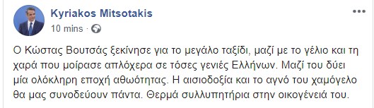 "Ο Κώστας Βουτσάς ξεκίνησε για το μεγάλο ταξίδι, μαζί με το γέλιο και τη χαρά που μοίρασε απλόχερα σε τόσες γενιές Ελλήνων" έγραψε στον λογαριασμό του στο Facebook ο Πρωθυπουργός, Κυριάκος Μητσοτάκης.