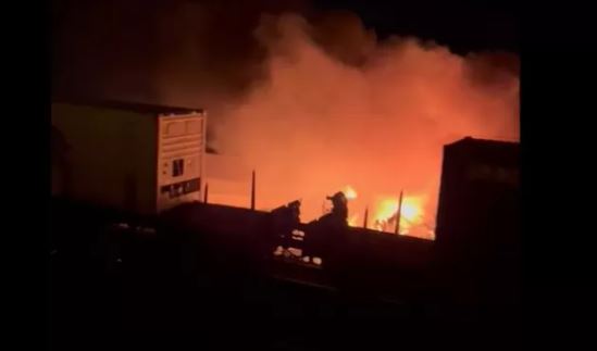 Είναι χαρακτηριστικό ότι το σημείο θυμίζει βομβαρδισμένο τοπίο, ενώ τα βαγόνια έχουν παραδοθεί στις φλόγες.
