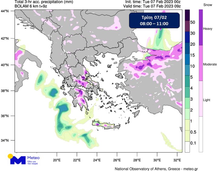 1) Οι χιονοπτώσεις που ήδη εκδηλώνονται κατά τόπους στην ανατολική και νότια χώρα προβλέπεται να συνεχιστούν στις Σποράδες, την ανατολική Θεσσαλία, την Εύβοια, την ανατολική Στερεά, καθώς και σε ορεινές και ημιορεινές περιοχές της ανατολικής Πελοποννήσου, των Κυκλάδων και της Κρήτης. Ειδικότερα για την ανατολική Μαγνησία, την κεντρική και βόρεια Εύβοια, τη Φθιώτιδα και τη Βοιωτία προβλέπεται κατά τόπους ένταση των φαινομένων μέχρι και το απόγευμα.