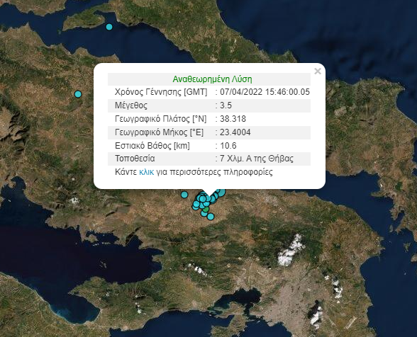 Νέα σεισμική δόνηση 3,5 Ρίχτερ σημειώθηκε στη Θήβα μετά τον διπλό σεισμό των 3,8 και 3,7βαθμών της κλίμακας Ρίχτερ το μεσημέρι της Πέμπτης, οι οποίοι ήταν αισθητοί και στην Αττική.
