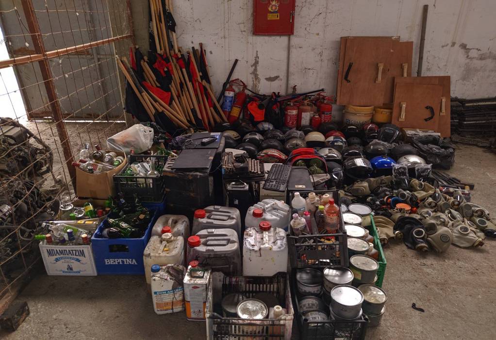 Στην επιχείρηση που πραγματοποιήθηκε πρωινές ώρες χθες (17-08-2020) και στην οποία συμμετείχαν αστυνομικοί των Διευθύνσεων Ασφαλείας, Αστυνομικών Επιχειρήσεων, Άμεσης Δράσης και Τροχαίας Θεσσαλονίκης, της Υποδιεύθυνσης Ειδικών Αστυνομικών Δυνάμεων Βορείου Ελλάδος και της Υποδιεύθυνσης Εγκληματολογικών Ερευνών Βορείου Ελλάδος, βρέθηκαν στους χώρους του κτηρίου και κατασχέθηκαν κράνη, κοντάρια, αυτοσχέδιοι εκρηκτικοί μηχανισμοί (μολότοφ), δοχεία με εύφλεκτο υλικό, μαχαίρια, ξύλινες ασπίδες, αντιασφυξιογόνες μάσκες, κροτίδες και πυροτεχνικές κατασκευές, πυροσβεστήρες, ασύρματοι, γραφομηχανή, μεγάλου μεγέθους τυπογραφική μηχανή και μηχάνημα κοπής χάρτου, πλαστή ταυτότητα, ηλεκτρονικοί υπολογιστές, χρηματικό ποσό, βιβλίο οικονομικών συνεισφορών, έντυπο υλικό κ.λ.π.