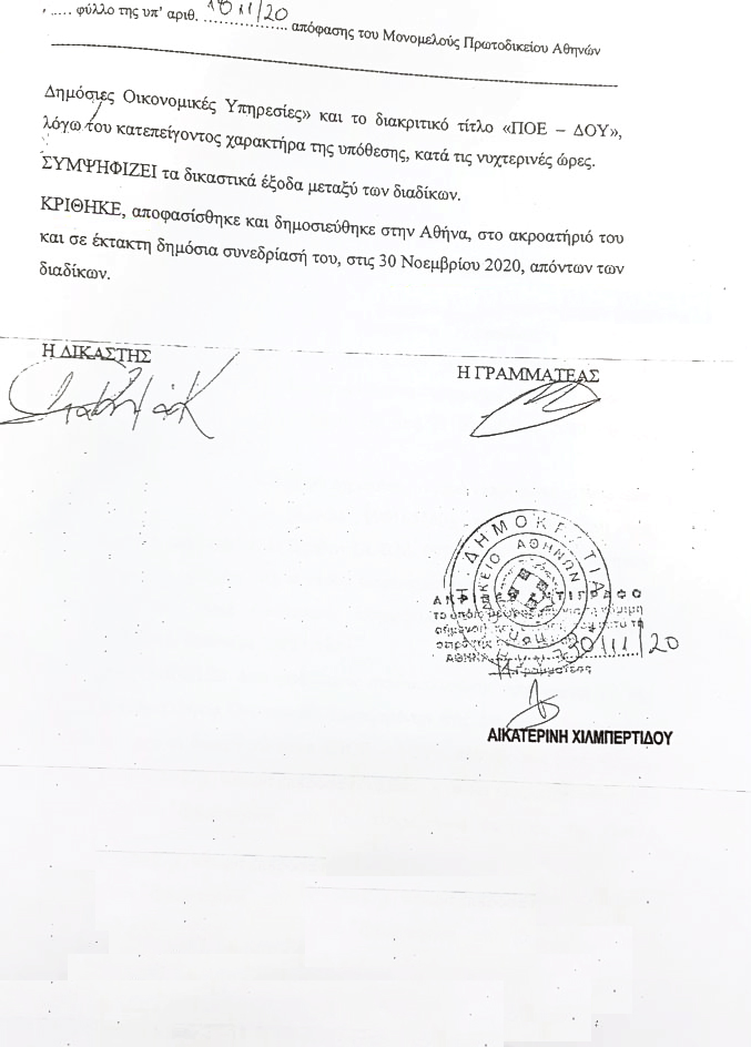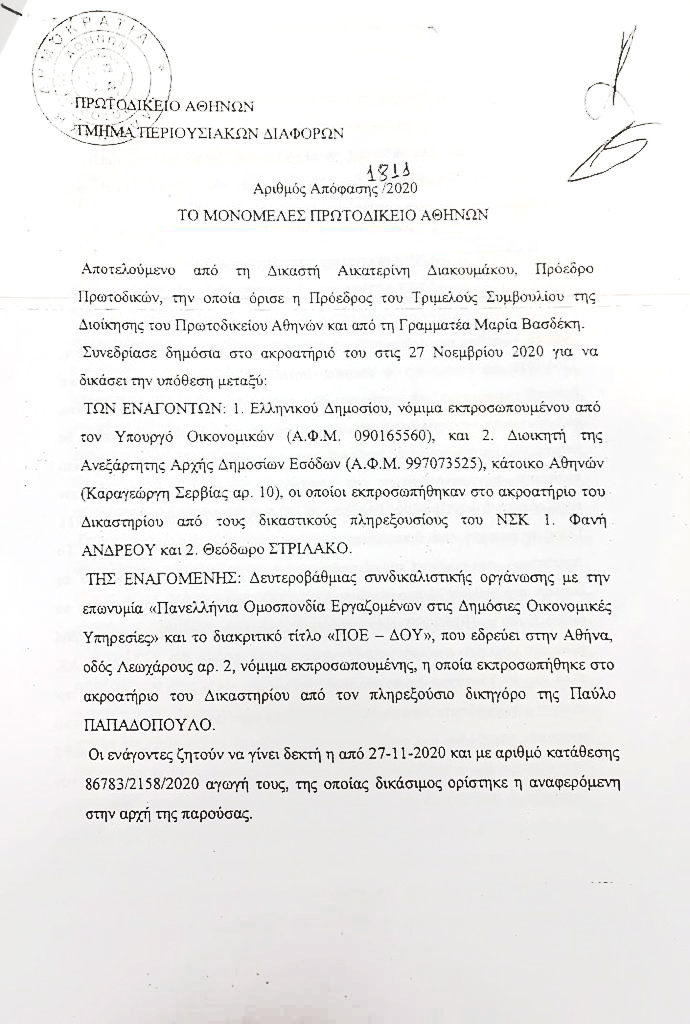 Παράνομες έκρινε το Μονομελές Πρωτοδικείο Αθηνών τις επαναλαμβανόμενες στάσεις εργασίας που έχει προκηρύξει η Πανελλήνια Ομοσπονδία Εργαζομένων στις Δημόσιες Οικονομικές Υπηρεσίες (ΠΟΕ-ΔΟΥ) από αύριο κατά τις ώρες 3 μμ έως 7 μμ.