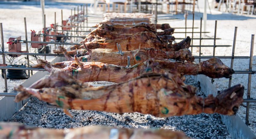 Με αρκετή υπομονή, ραντίσματα νερού και χτυπήματα στα φλεγόμενα κλαδιά, η θράκα ετοιμάζεται και μπαίνουν επάνω τα αρνιά. Το ψήσιμο και το γλέντι κρατούν μέχρι αργά το απόγευμα, συνοδεία τοπικής μουσικής και άφθονου κρασιού.