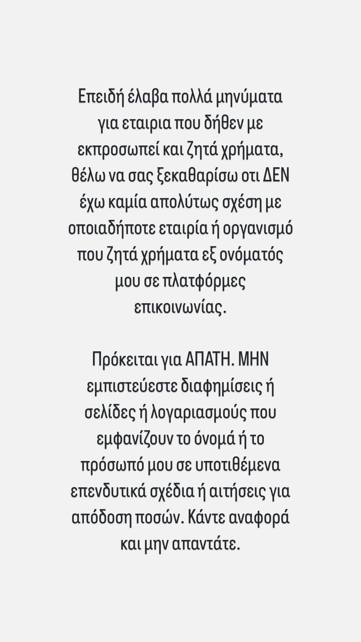 Ζήτησε επίσης από τους χιλιάδες followers του να είναι ιδιαίτερα προσεκτικοί και να μην εμπιστευτούν διαφημίσεις, λογαριασμούς ή σελίδες που εμφανίζουν το όνομα ή το πρόσωπό μου σε υποτιθέμενα επενδυτικά σχέδια ή αιτήσεις για απόδοση ποσών.
