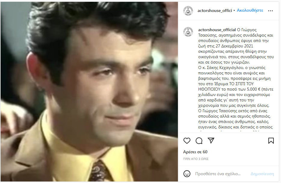 Ο ηθοποιός άφησε την τελευταία του πνοή στις 27 Δεκεμβρίου. Η είδηση του θανάτου του έκανε γνωστή σήμερα, μέσω ανάρτησης στο Instagram, το Σπίτι του Ηθοποιού.