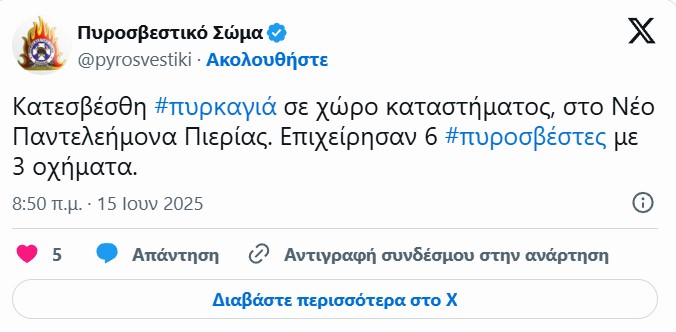Πιερία: Πυρκαγιά σε σούπερ μάρκετ στον Νέο Παντελεήμονα