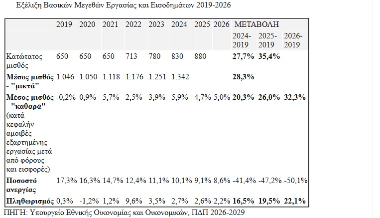 Σύμφωνα με τα στοιχεία του ΠΔΠ, σε σχέση με φέτος, το 2026 αναμένεται αύξηση 5% στις «καθαρές» από φόρους και εισφορές μέσες αμοιβές εξαρτημένης εργασίας, σε σχέση με το 2025, άνοδος υπερδιπλάσια από την αύξηση του πληθωρισμού που αναμένεται να μην ξεπεράσει το 2,2%