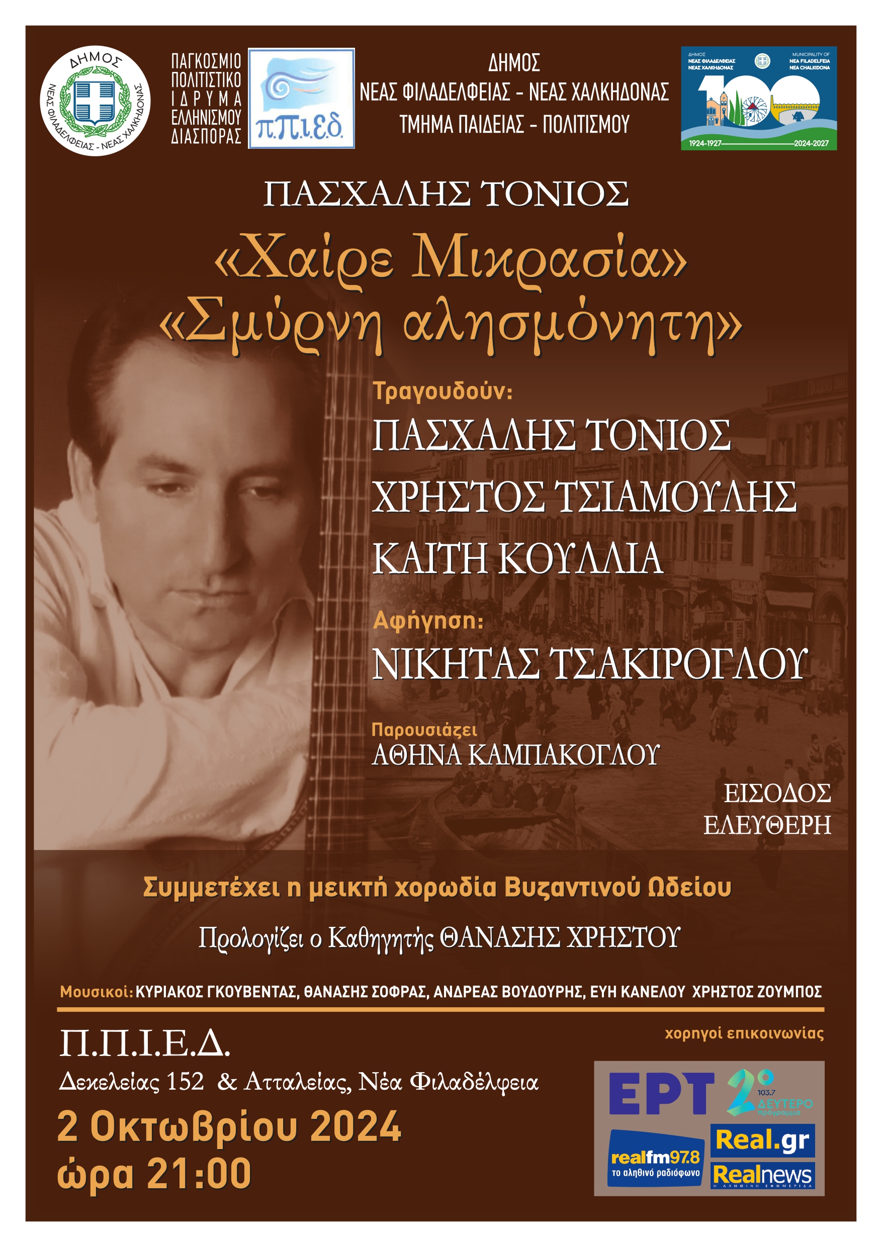 Τραγουδούν: Πασχάλης Τόνιος, Χρήστος Τσιαμούλης, Καίτη Κουλιά, αφήγηση Νικήτας Τσακίρογλου, 5μελή ορχήστρα, Μεικτή χορωδία, θα προλογίσει για την μικρασιατική καταστροφή ο καθηγητής πανεπιστημίου Θανάσης Χρήστου, Παρουσίαση Αθηνά Καμπάκογλου.
