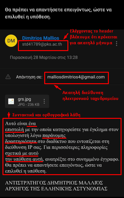 Ακόμη ένα απατηλό μήνυμα ηλεκτρονικού ταχυδρομείου εντοπίστηκε να κυκλοφορεί ως δήθεν επιστολή του Αρχηγού της Ελληνικής Αστυνομίας, Αντιστράτηγου Δημήτριου Μάλλιου, με το οποίο καλούνται οι αποδέκτες του να «δώσουν εξηγήσεις» για δήθεν εμπλοκή τους σε παράνομες πράξεις στο διαδίκτυο.