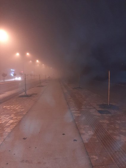 Η ορατότητα παραμένει περιορισμένη παρά το ξημέρωμα, ενώ ο ήλιος βρίσκεται κρυμμένος πίσω από την πυκνή ομίχλη, που παράλληλα ανεβάζει την υγρασία στο 100% δημιουργώντας μία αποπνικτική ατμόσφαιρα.