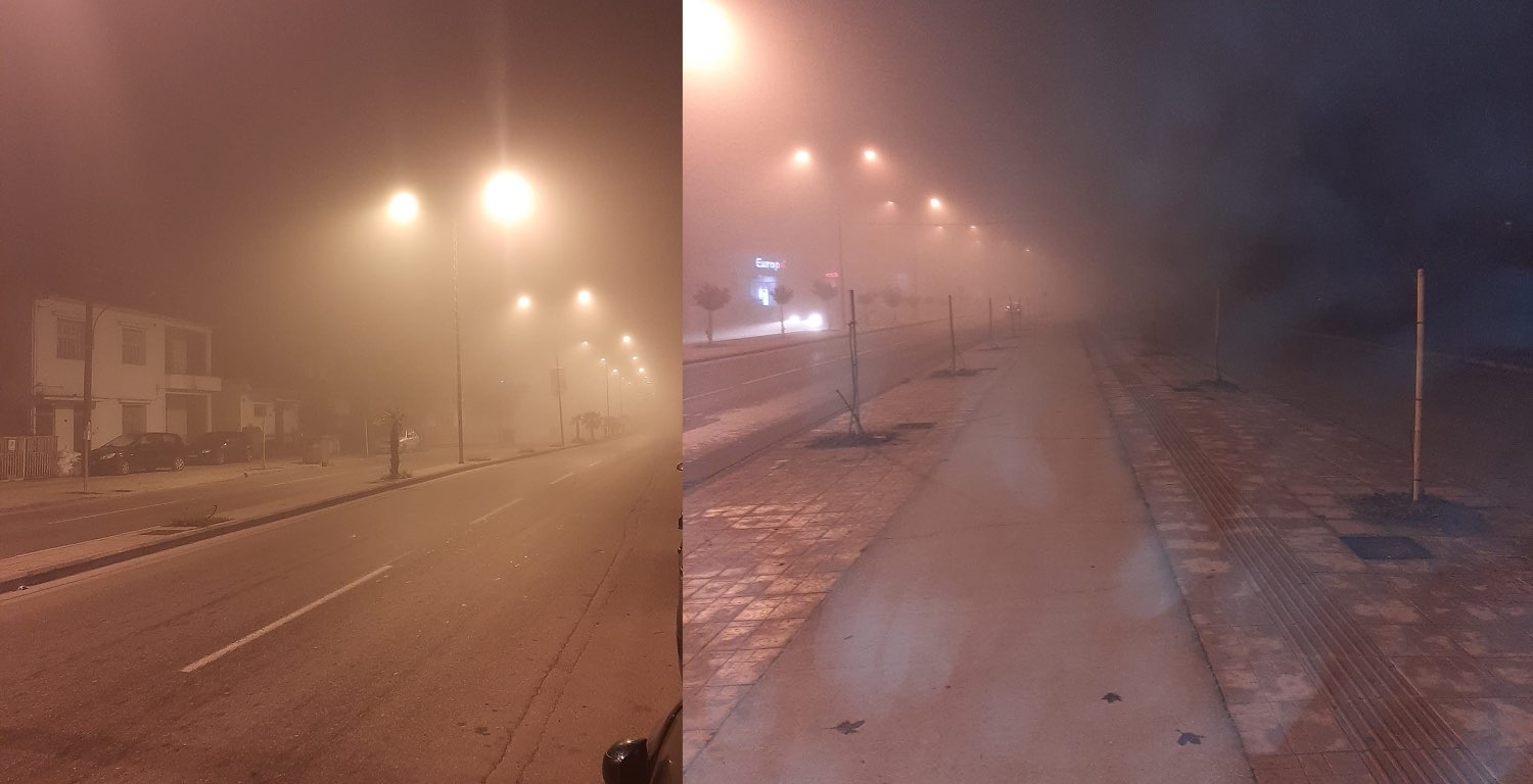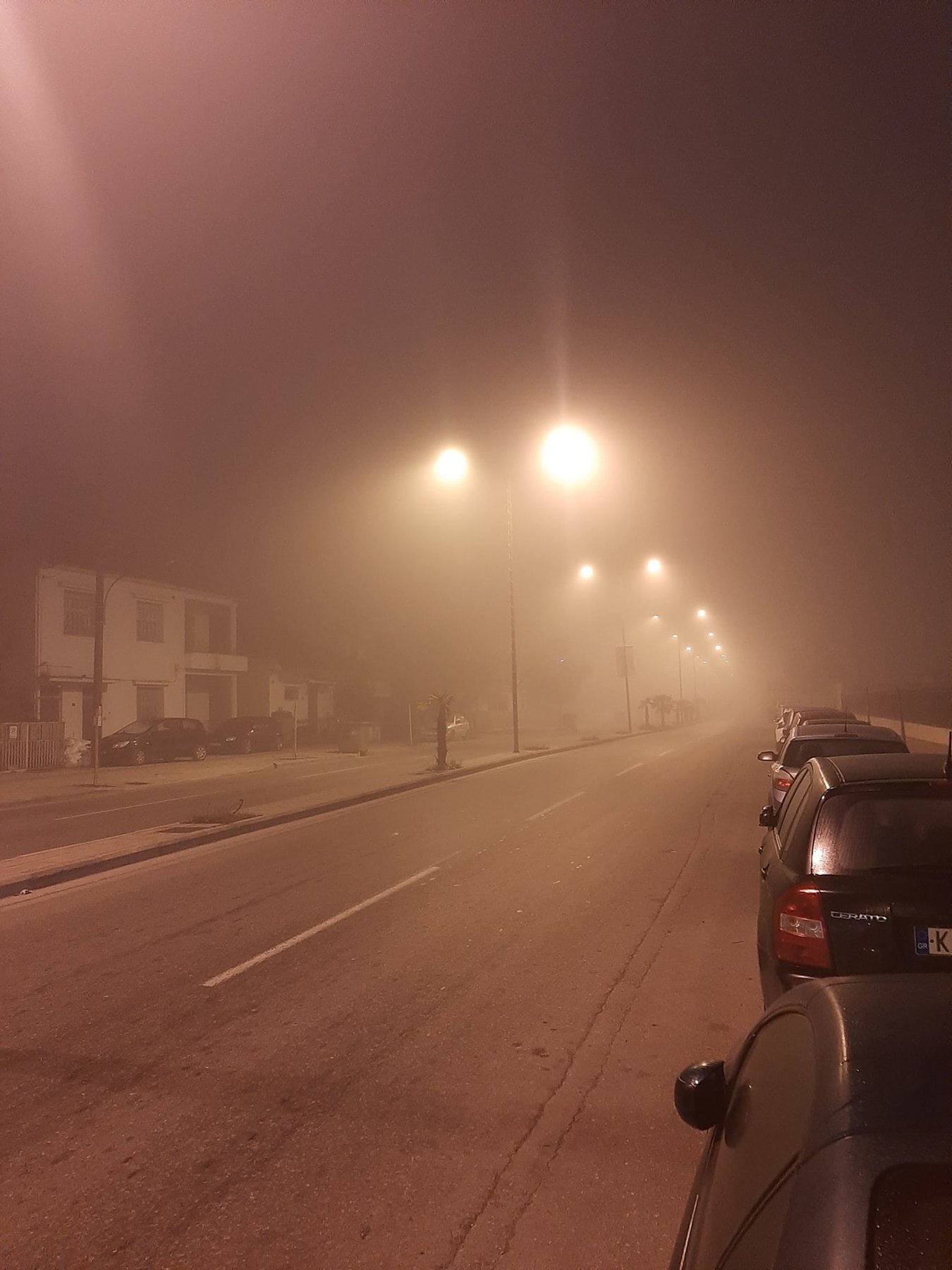 Η ορατότητα παραμένει περιορισμένη παρά το ξημέρωμα, ενώ ο ήλιος βρίσκεται κρυμμένος πίσω από την πυκνή ομίχλη, που παράλληλα ανεβάζει την υγρασία στο 100% δημιουργώντας μία αποπνικτική ατμόσφαιρα.